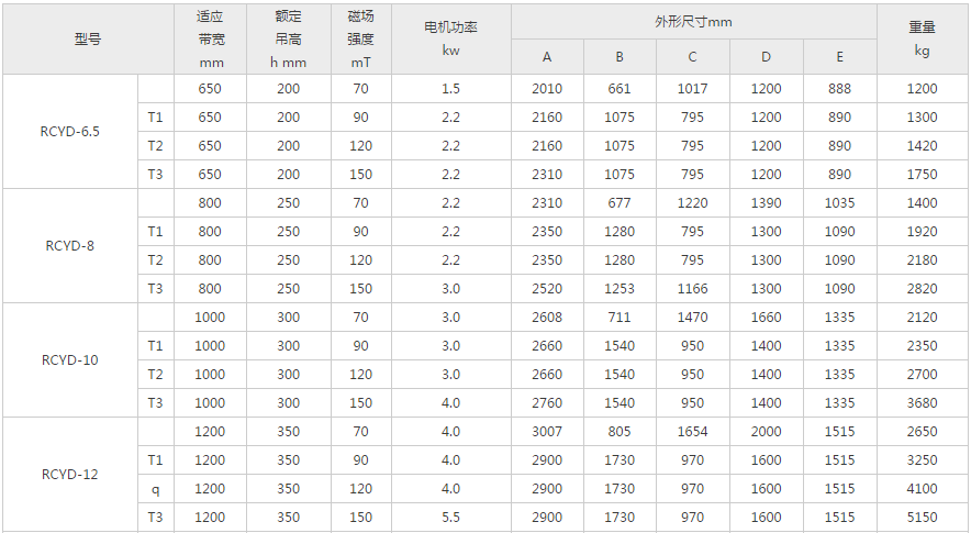 RCYD型永磁自卸式除鐵器與RCYC系列型號等同,適用于各行業(yè)輸送帶輸料除鐵。可實現(xiàn)連續(xù)不斷的吸棄鐵。皮帶具有自動糾偏功能,運行可靠、維護簡單。其內(nèi)部磁路采用完善的結(jié)構(gòu),保障整機在惡劣環(huán)境中無故障長期運行。擁有防爆型和鎧裝型。