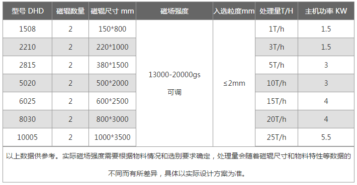 DHD型對輥干式磁選機(jī)是我公司經(jīng)多年市場經(jīng)驗研發(fā)的一種新型干選設(shè)備。其磁系經(jīng)過特殊設(shè)計、屬于永磁局部半閉合磁系結(jié)構(gòu);磁感應(yīng)強(qiáng)度大并且可在13000GS~20000GS范圍內(nèi)進(jìn)行調(diào)節(jié)。