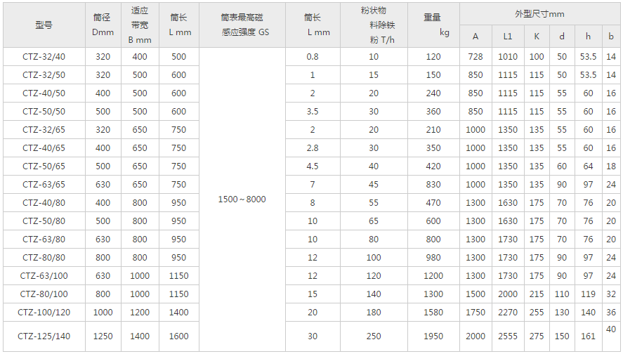 CTZ型中場(chǎng)強(qiáng)半磁滾筒(CTZ型中場(chǎng)強(qiáng)全磁滾筒結(jié)構(gòu)與RCT型參數(shù)等同),多用于對(duì)粉狀、顆粒狀、小塊狀物料的凈化處理,或?qū)﹁F質(zhì)的回收利用,對(duì)防止研磨機(jī)、壓榨機(jī)的破壞和磨損起著可靠的保護(hù)作用。它安裝方便、吸力強(qiáng)、低能耗、連續(xù)工作、操作簡(jiǎn)單。