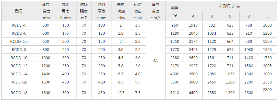 RCDD型自冷自卸式電磁除鐵器是一種用于自動處理粉狀或塊狀非磁性物料中雜鐵的除鐵裝置。其內部采用電工專用樹脂澆注,自冷式全密封結構。具有透磁大、吸力強、防塵、防雨、耐腐蝕、皮帶可自動糾偏等優點,在惡劣的環境中仍能可靠運行。