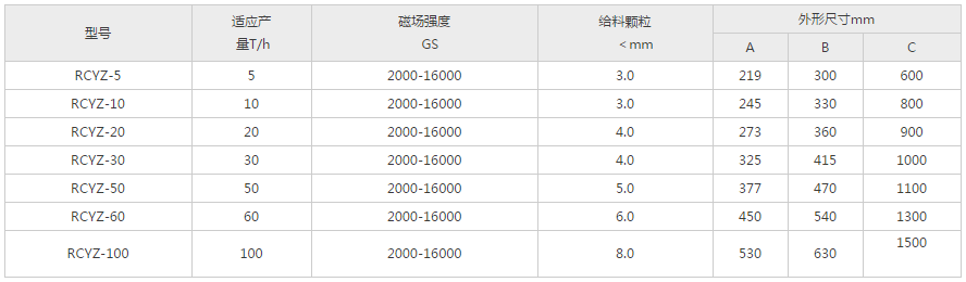 RCYZ型垂直管道式永磁除鐵器是一種以永磁材料產生強大磁場吸引力的節能型設備,內部采用釹鐵硼材料組成的環狀磁系,圓錐形體,結構合理,磁場強度高??膳c固態原料輸送設備連接,活動式門扣,處理鐵質方便,適用于食品、面粉、陶瓷、化工、水泥、建材、石英砂等行業各類固態小顆粒和粉末狀物料中除鐵。